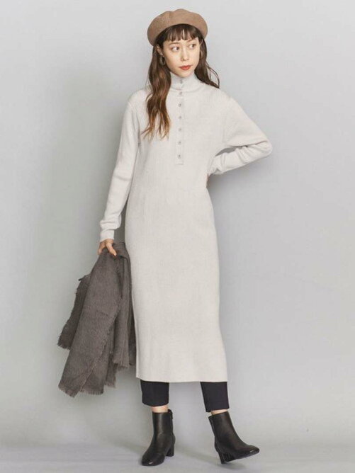 BYウールアクリルボタンハイネックリブワンピース